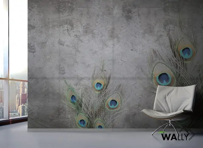 • Code di pavone, simbolo di vanità, su texture di muro grezzo. I colori accesi delle piume contrastano perfettamente col tono di grigio dello sfondo.Nota:Richiedi questo prodotto per interno doccia, zone bagno, paraschizzi cucina o ambienti esterni cliccando QUI