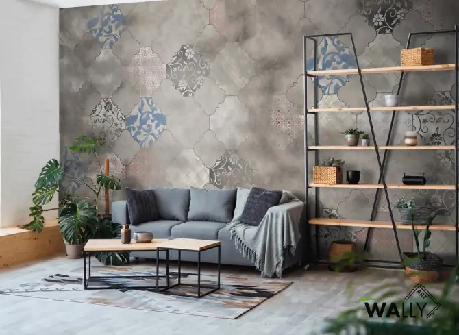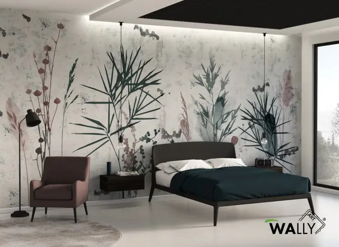 • Carta da parati a tema floreale con elementi naturali che cadono su un fondo vintage geometrico.  Nota:Richiedi questo prodotto in Fibra di vetro per interno doccia, zone bagno, paraschizzi cucina o ambienti esterni cliccando QUI