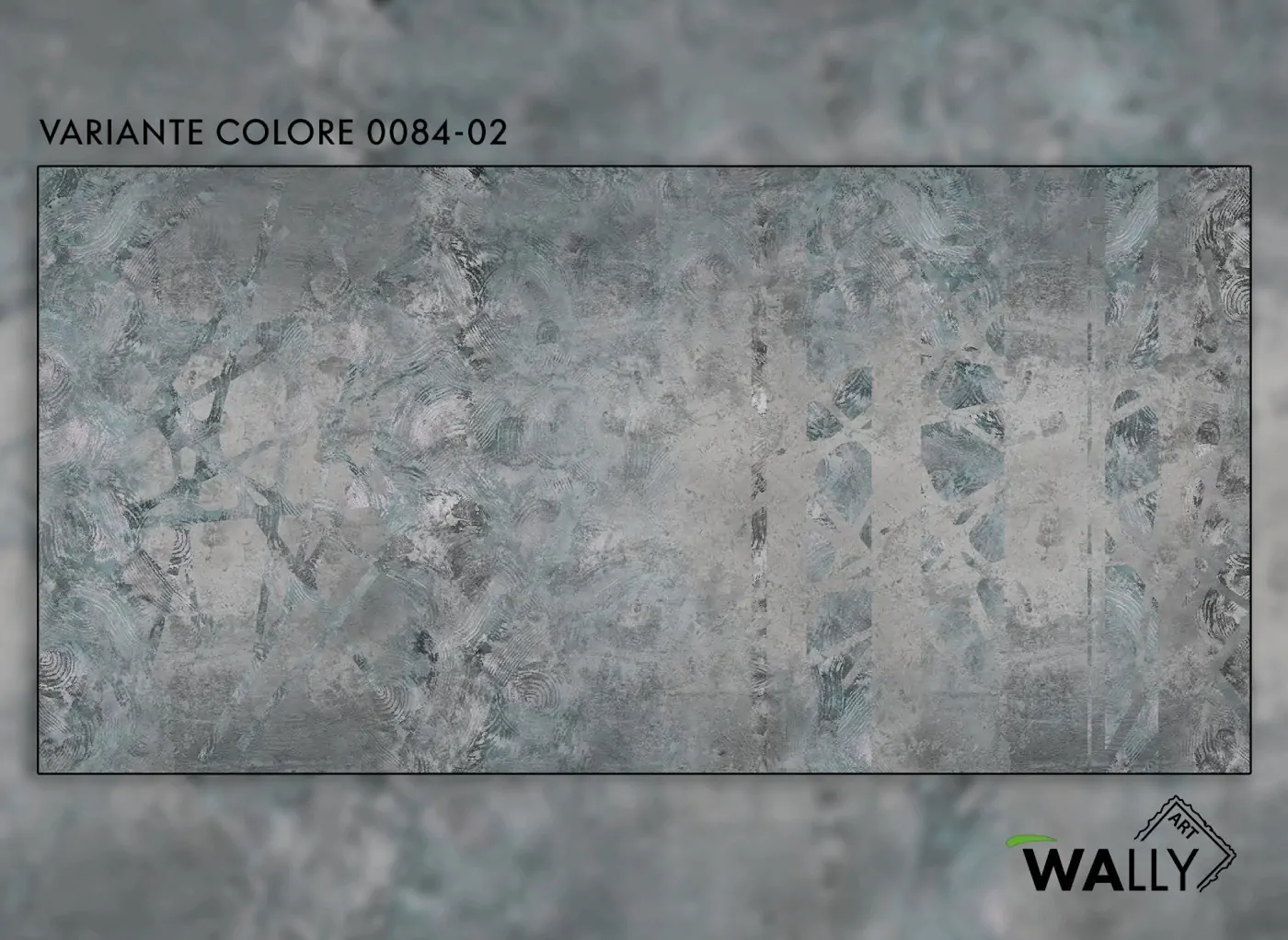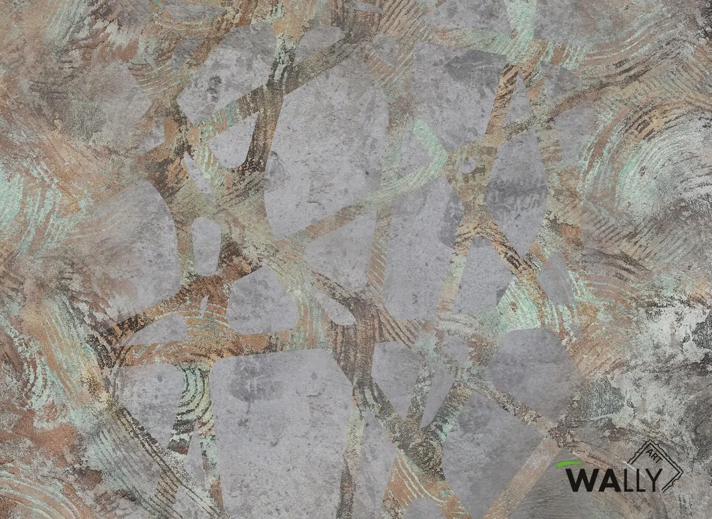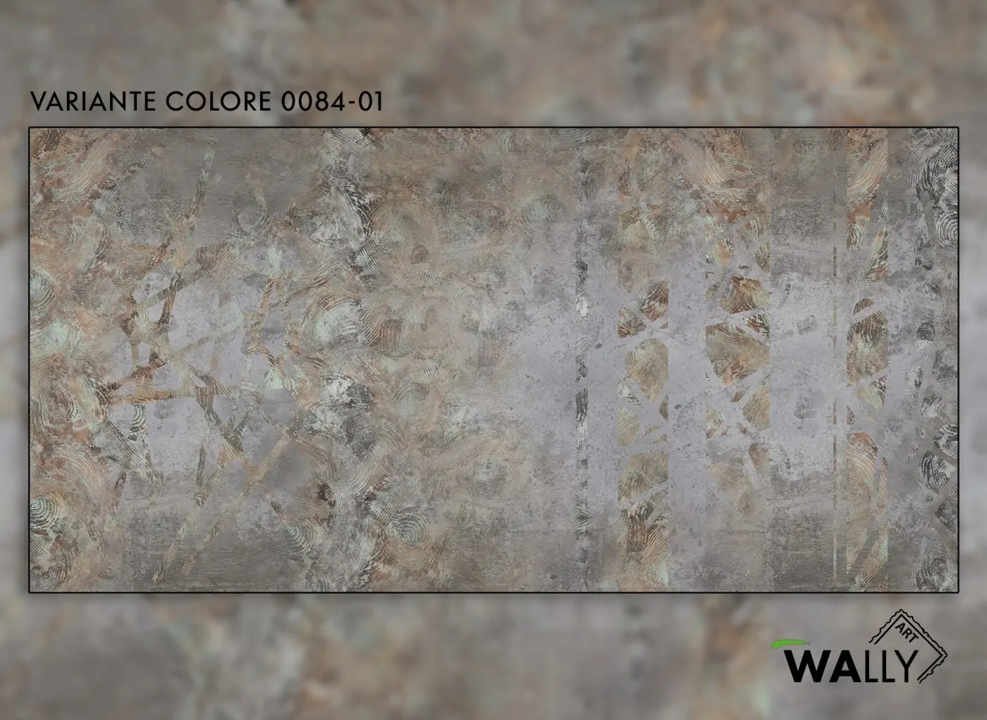 Un effetto metallico-verderame che sembra uscire fuori dalla parete attraverso gli scorci che si creano da una rete di sagome geometriche. Sensazione di potenza e prestigio.