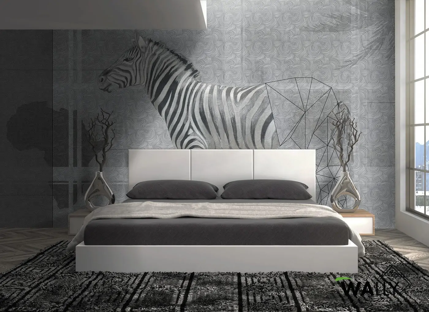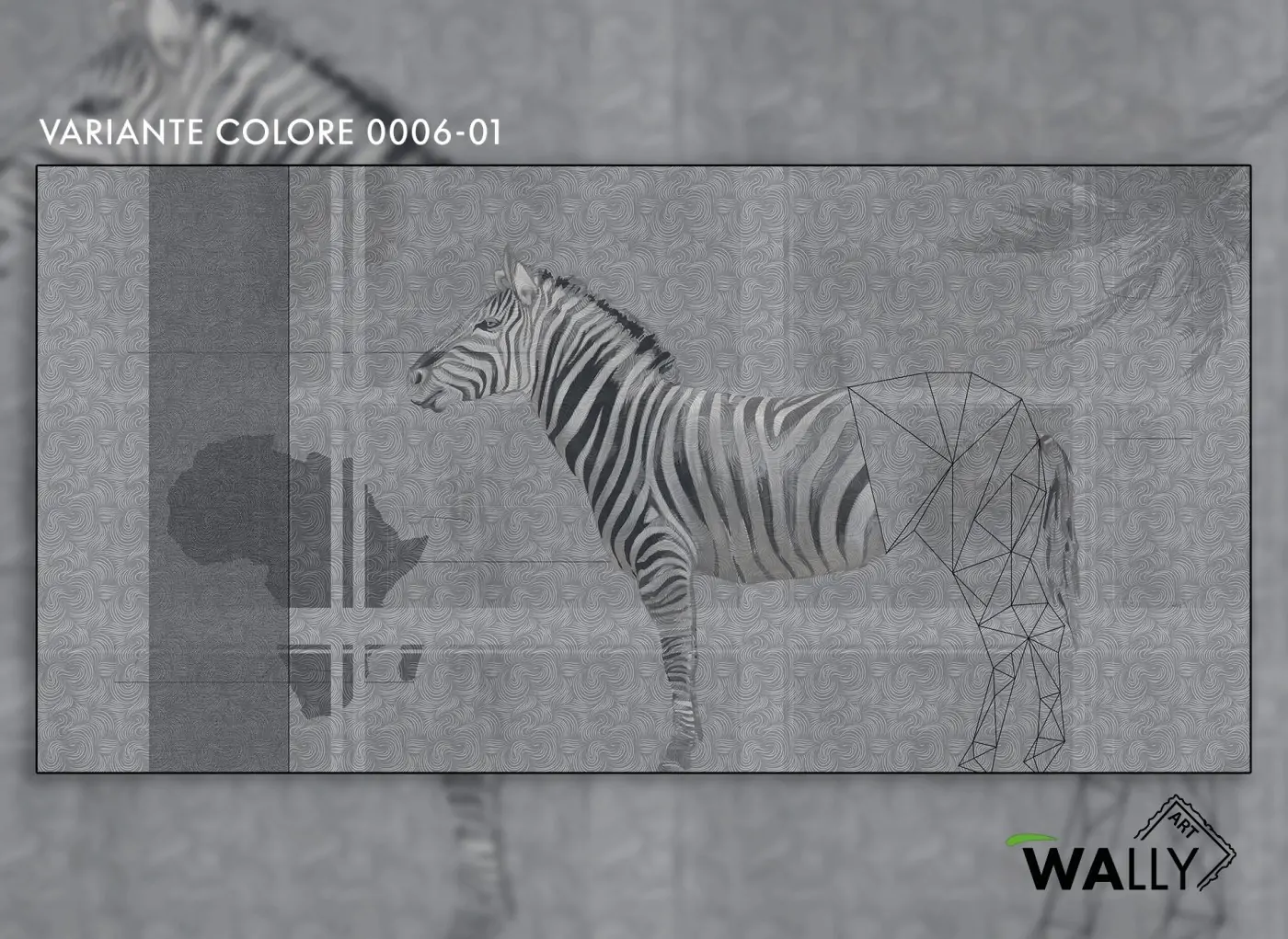 Un buon modo per combattere i sintomi del mal d'Africa è sicuramente quello di portare un po' di Africa qui. Figura di zebra in parte affrescata ed in parte realizzata con la tecnica del Low Poly su texture di fondo con elementi in bianco e nero.