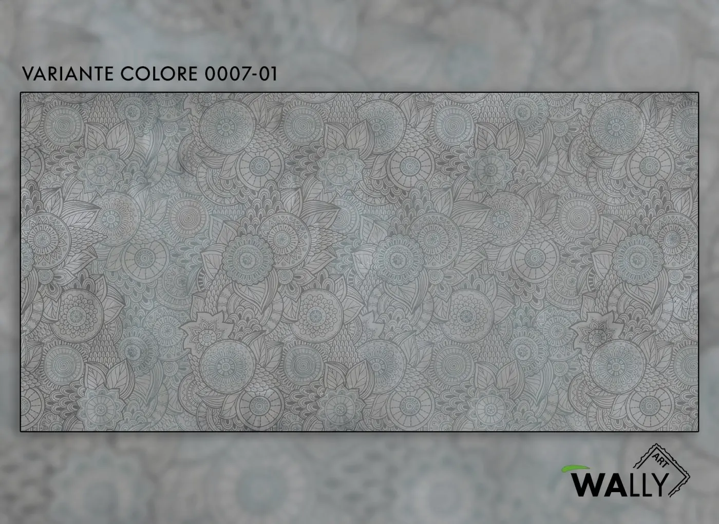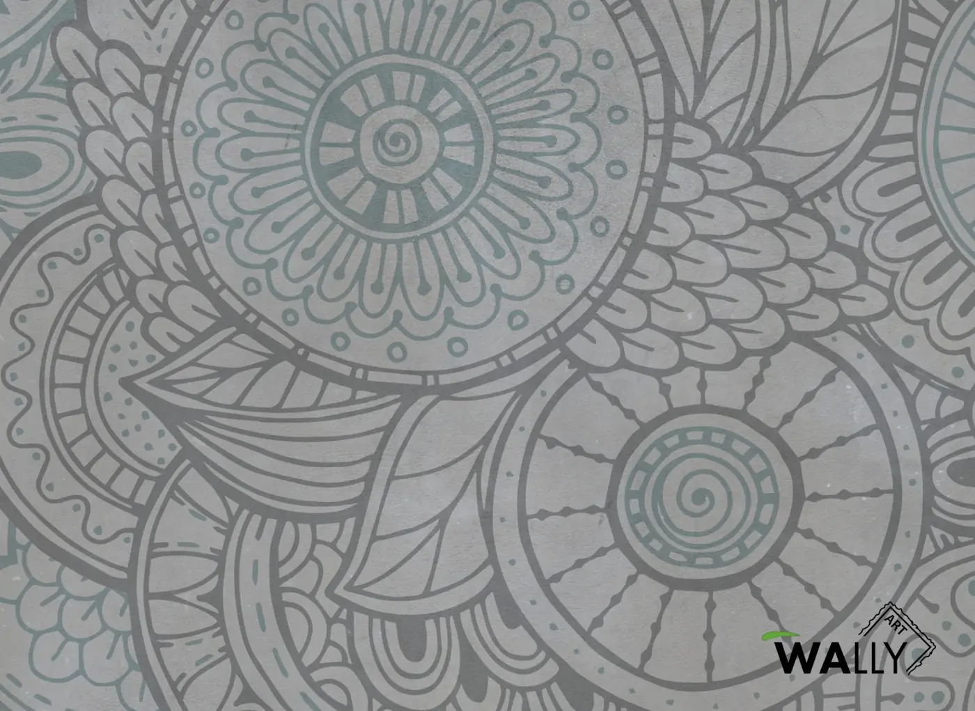 Un pattern stilizzato con forme floreali geometriche è sempre un ottimo compromesso per decorare una parete in modo semplice ma allo stesso tempo di grande effetto. Artwork a toni di grigio antracite e verde acqua.