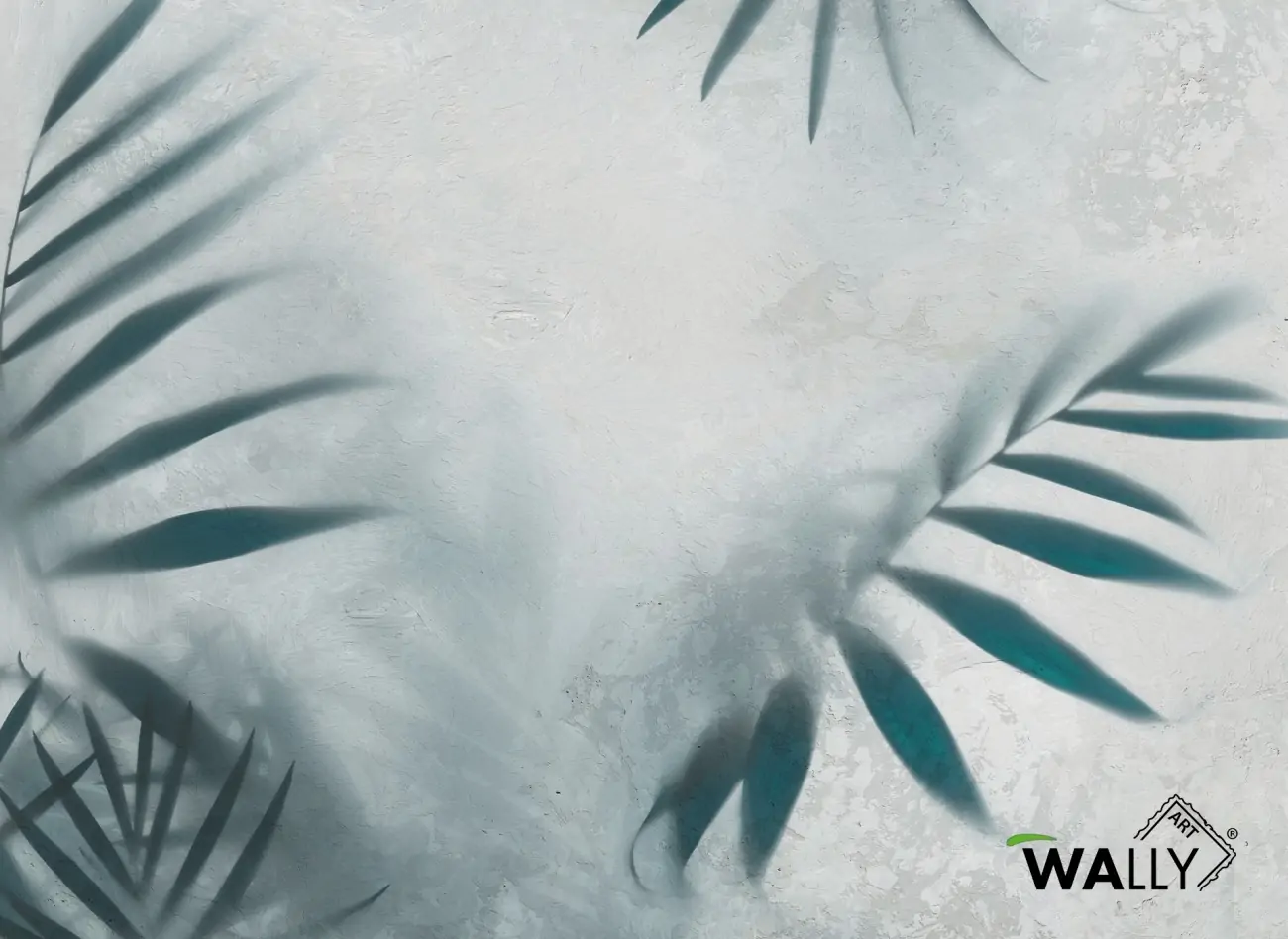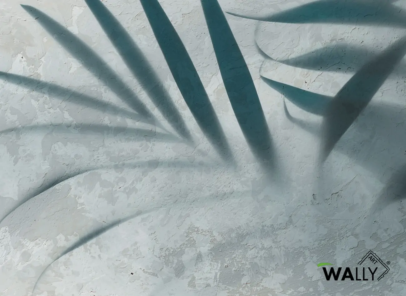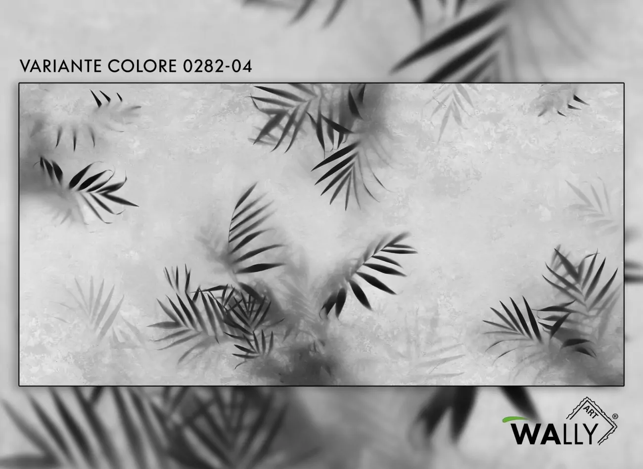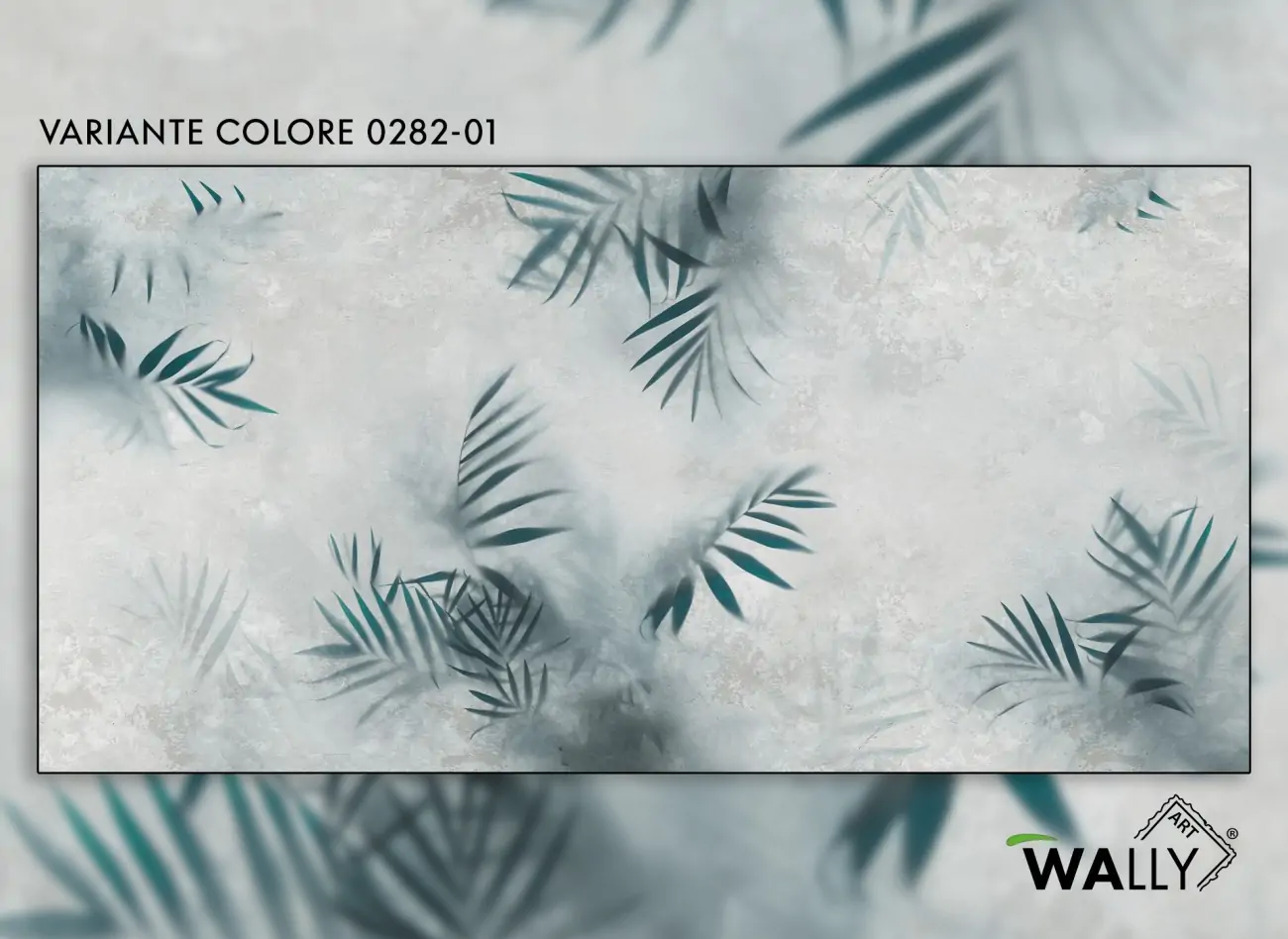 Le foglie dai toni colore vivaci, a tratti sfocate, escono fuori da una texture effetto cemento.