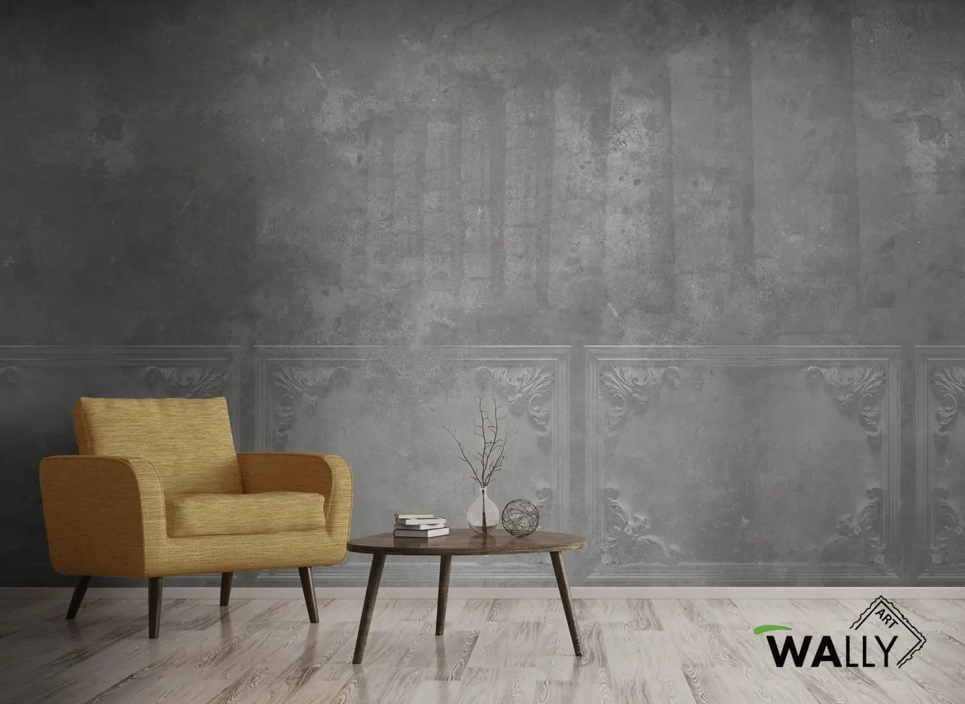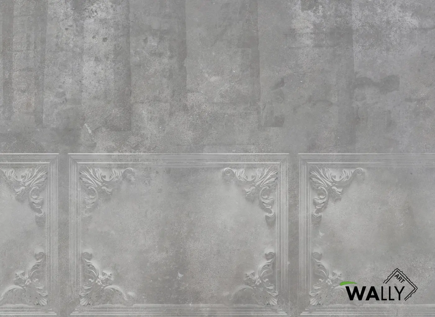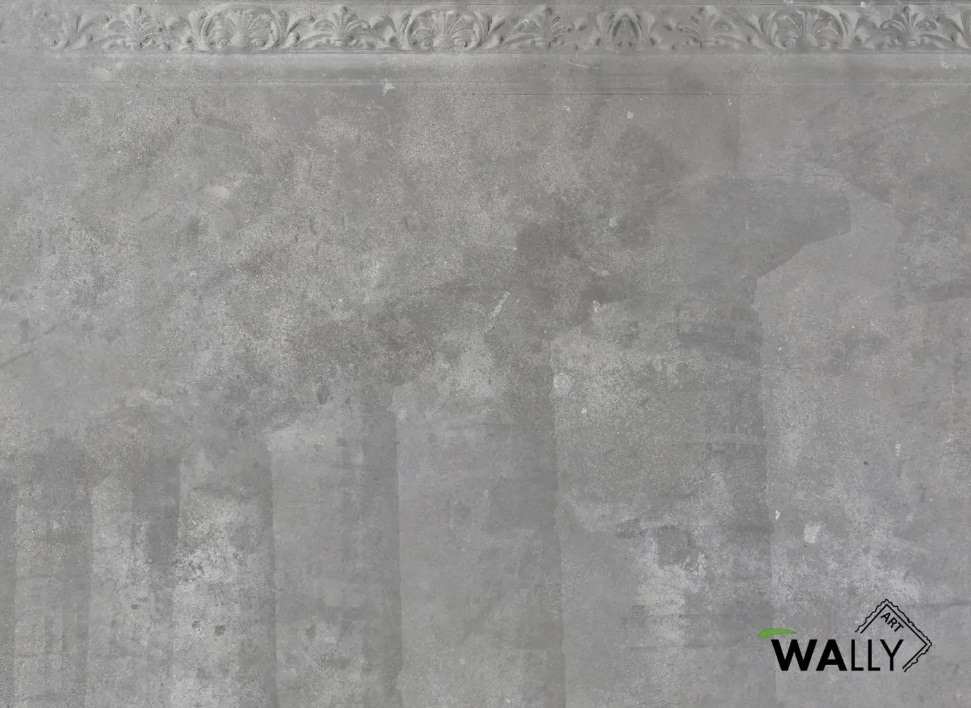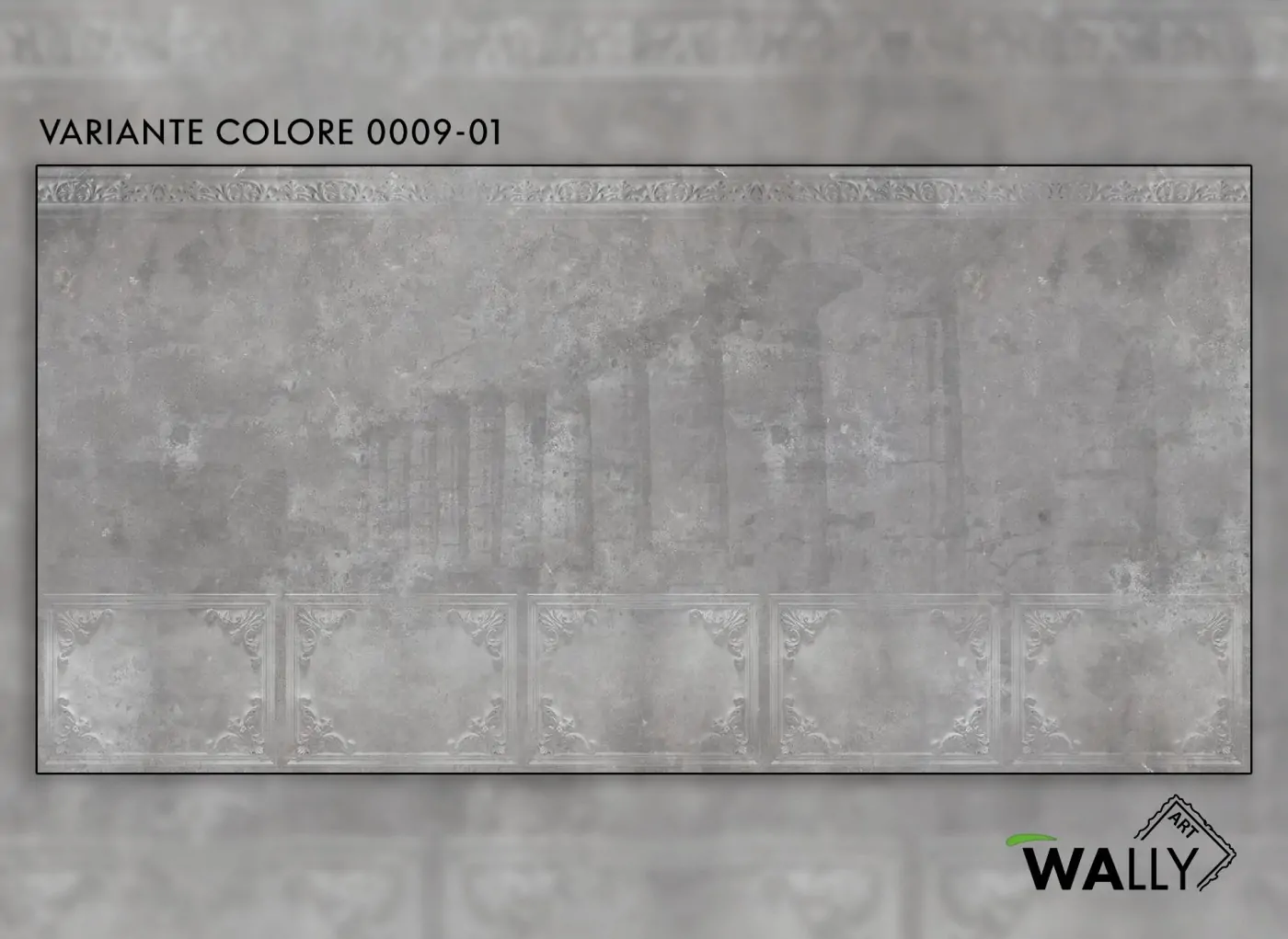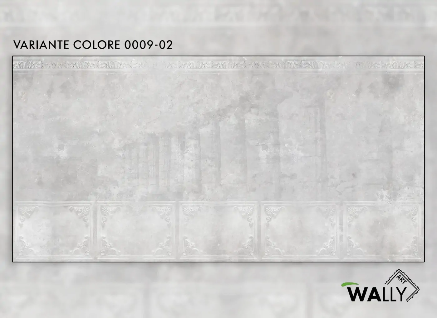 Rovine architettoniche su texture di muro grezzo. Fascia superiore ed inferiore con decori in basso rilievo. Fondo colore tortora.