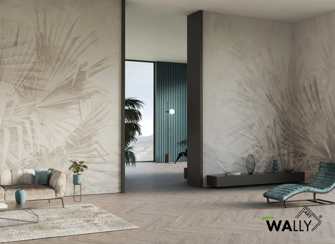 Una carta da parati con tratti tropicali raffinati e toni colore delicati.