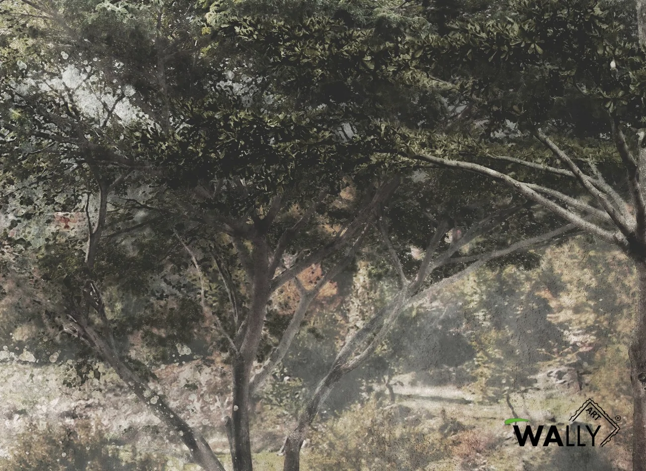 Una carta da parati con paesaggio panoramico provenzale. Alberi incantevoli in stile affresco.
