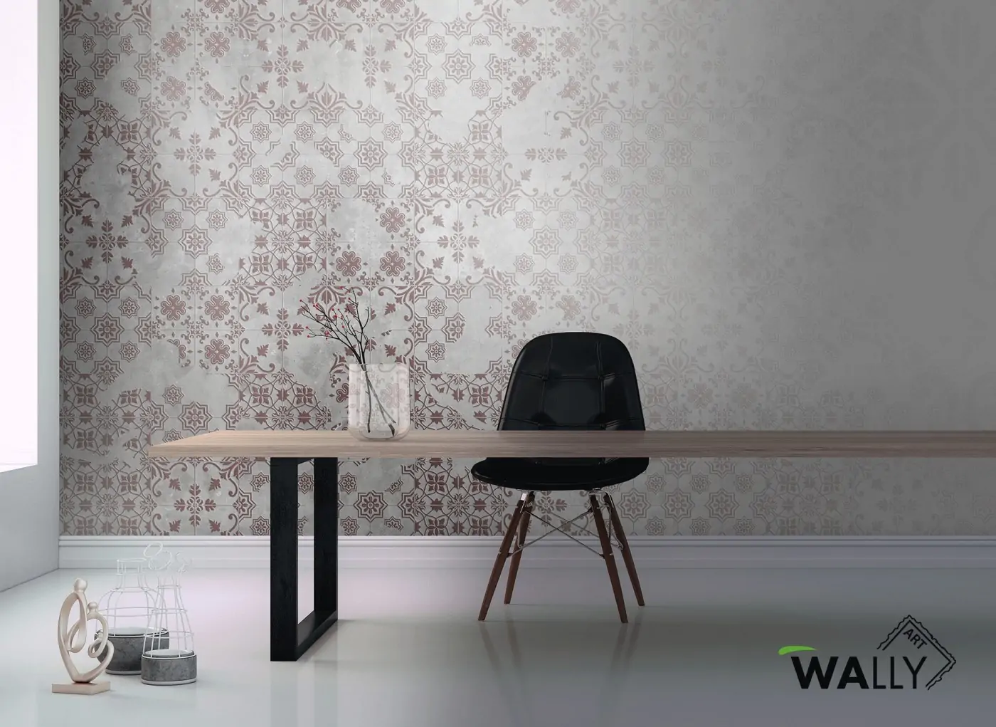 La classica maiolica rivisitata con una parte sfumata su texture di muro grezzo. Effetto vintage con colori neutro ed elementi in rosso mattone.
