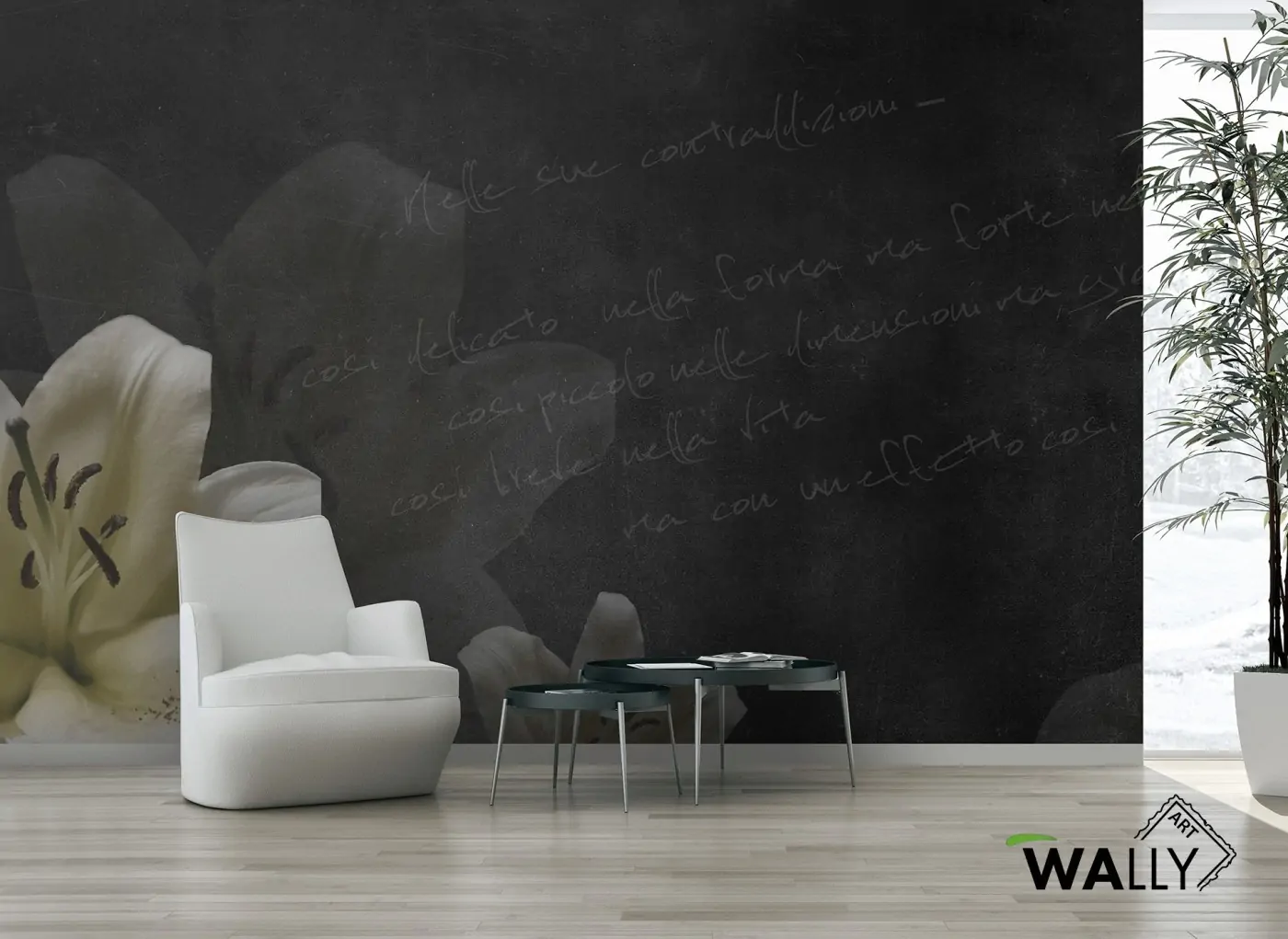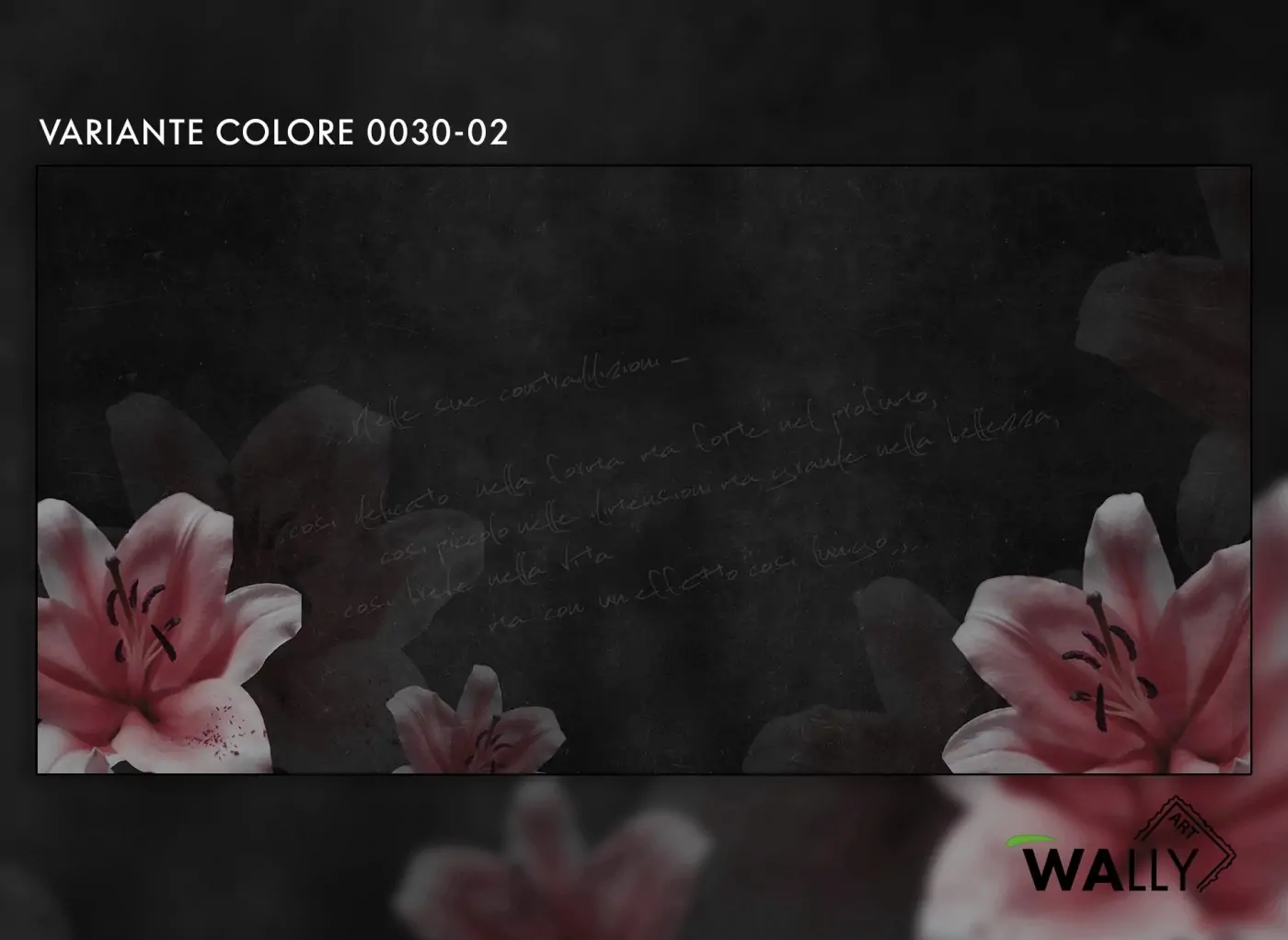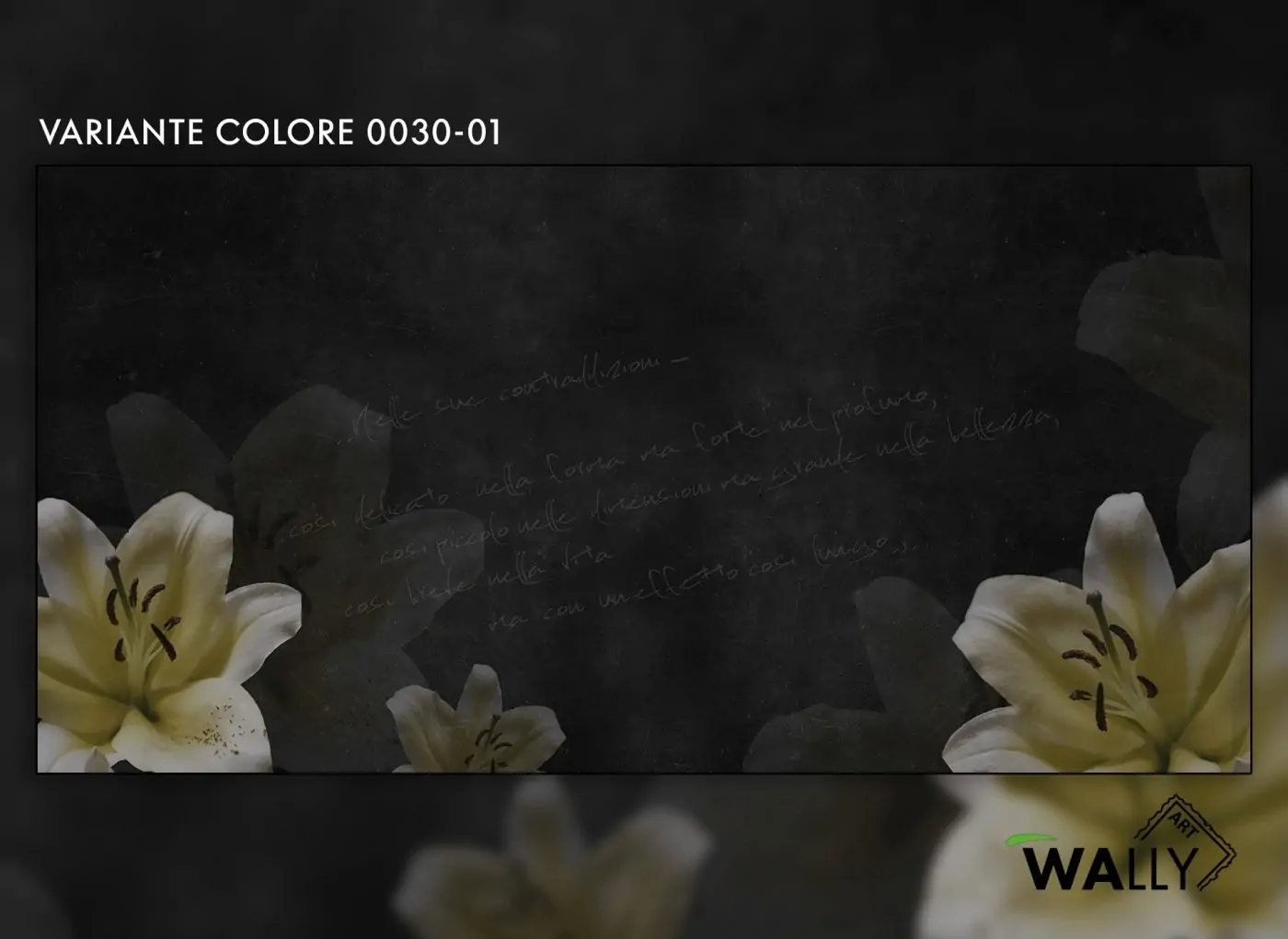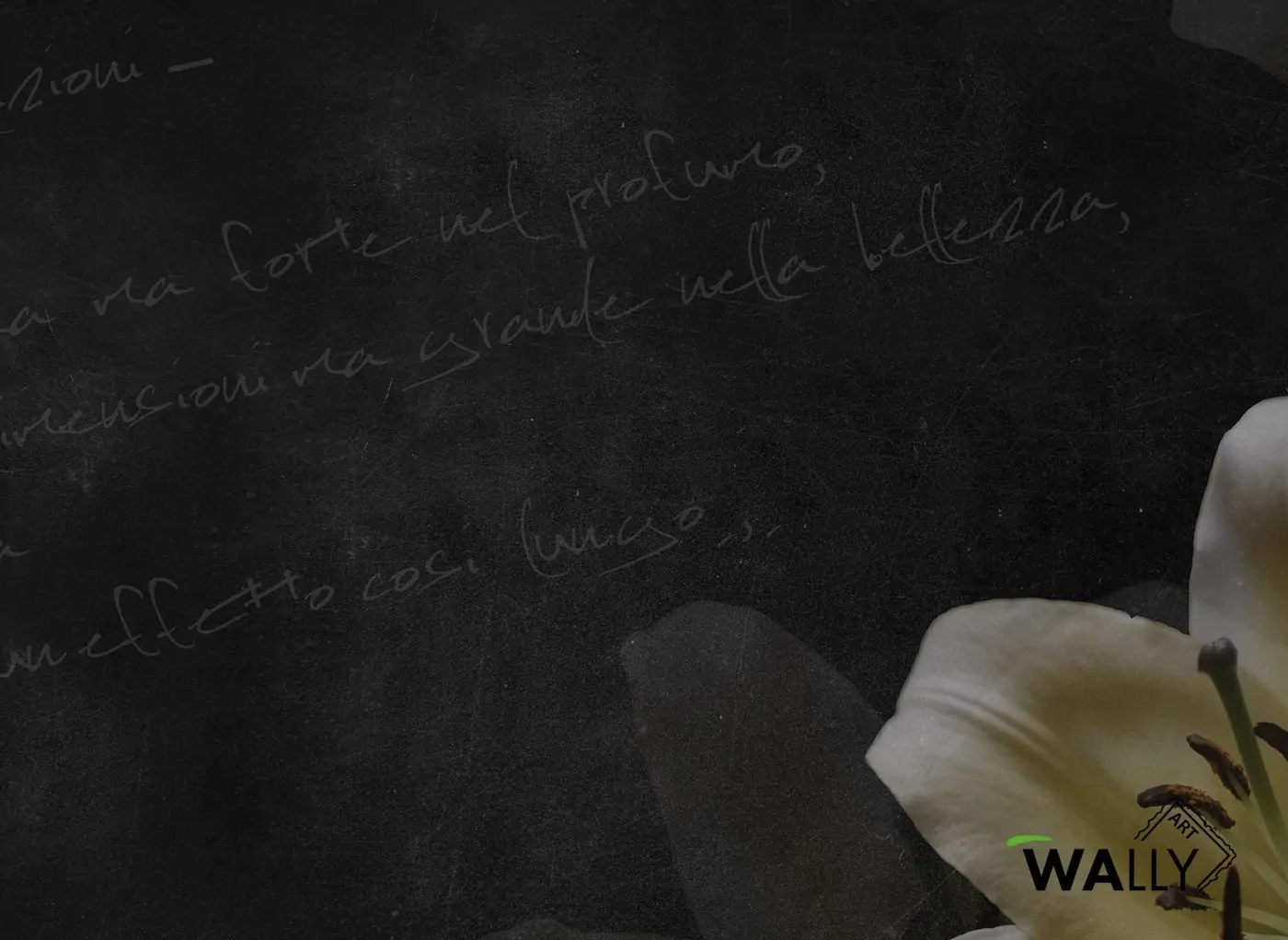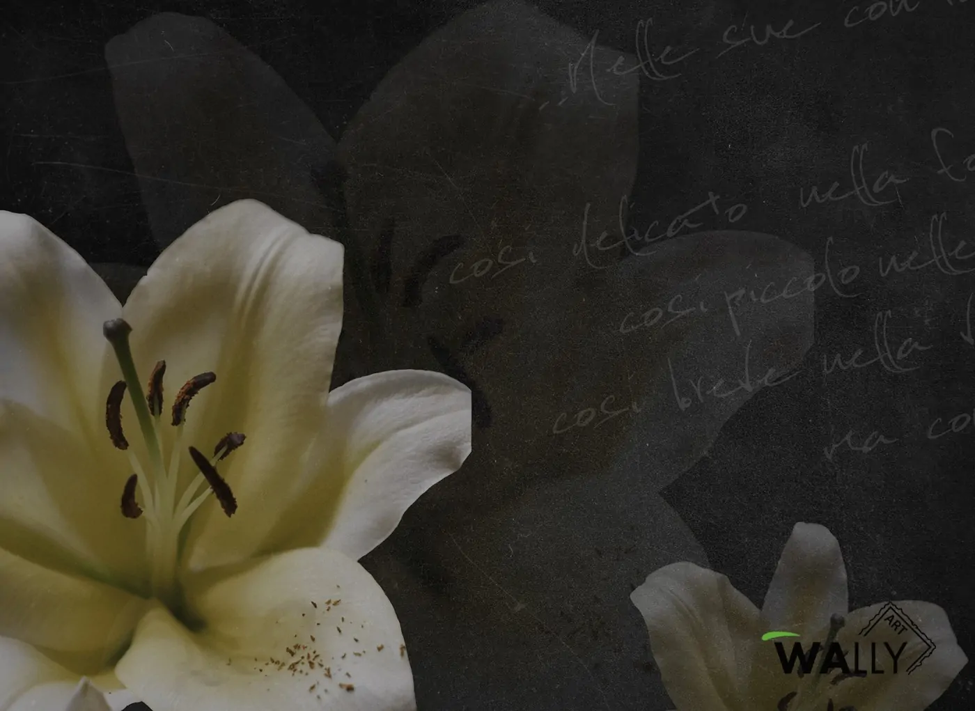 L'eleganza del giglio fa da protagonista in questa Artwork in cui si mescolano toni di bianco e nero. L'elemento principale si adagia su una finta lavagna con scritte in gesso.